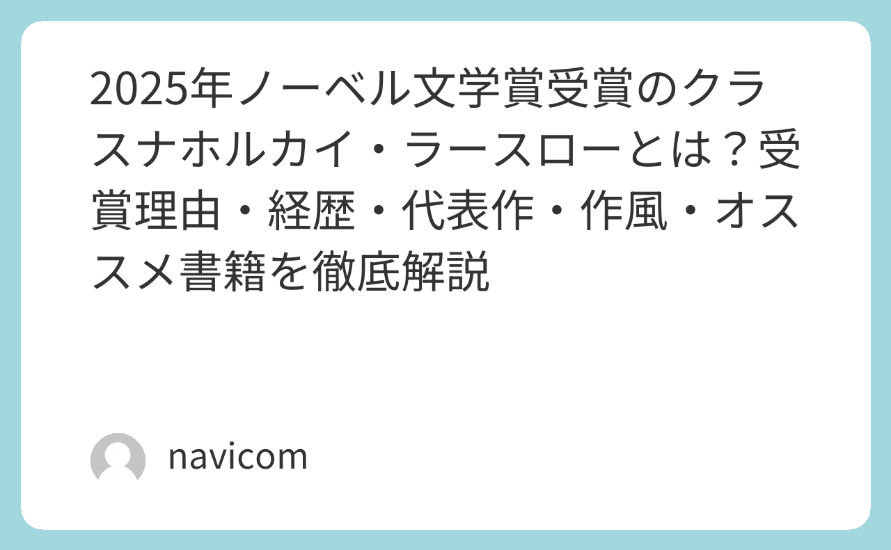 クラスナホルカイ・ラースローのノーベル文学賞受賞は、「言葉の密度と長い文体が持つ力」を世界が再認識する出来事です。賛否の分かれる作家ではありますが、人間の不安や群衆心理、社会の脆弱さを掘り下げる力は卓越しており、映画や翻訳といった他分野との協働も大きな魅力です。初めて彼を手に取るなら、まず短めの作品や寓話的な長篇から入り、徐々に長篇へ挑戦してください。読み終えたとき、あなたの中に残るのは「静かな不安」と同時に「強烈な美的な余韻」かもしれません。