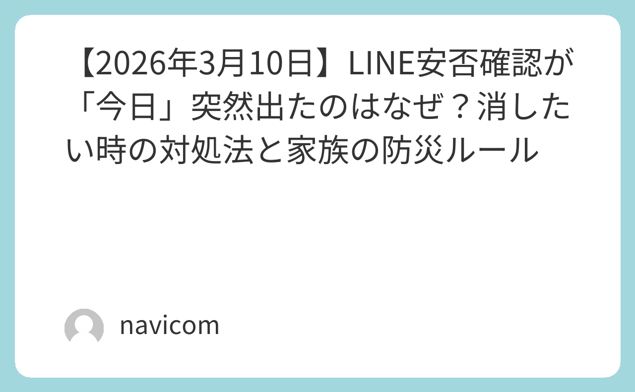 「今日」(2026年3月10日)、ふとスマホを開いてLINEの画面上部に真っ赤な「安否確認」の文字が表示され、「えっ、どこかで大地震が起きたの!?」とドキッとした保護者の方も多いのではないでしょうか。