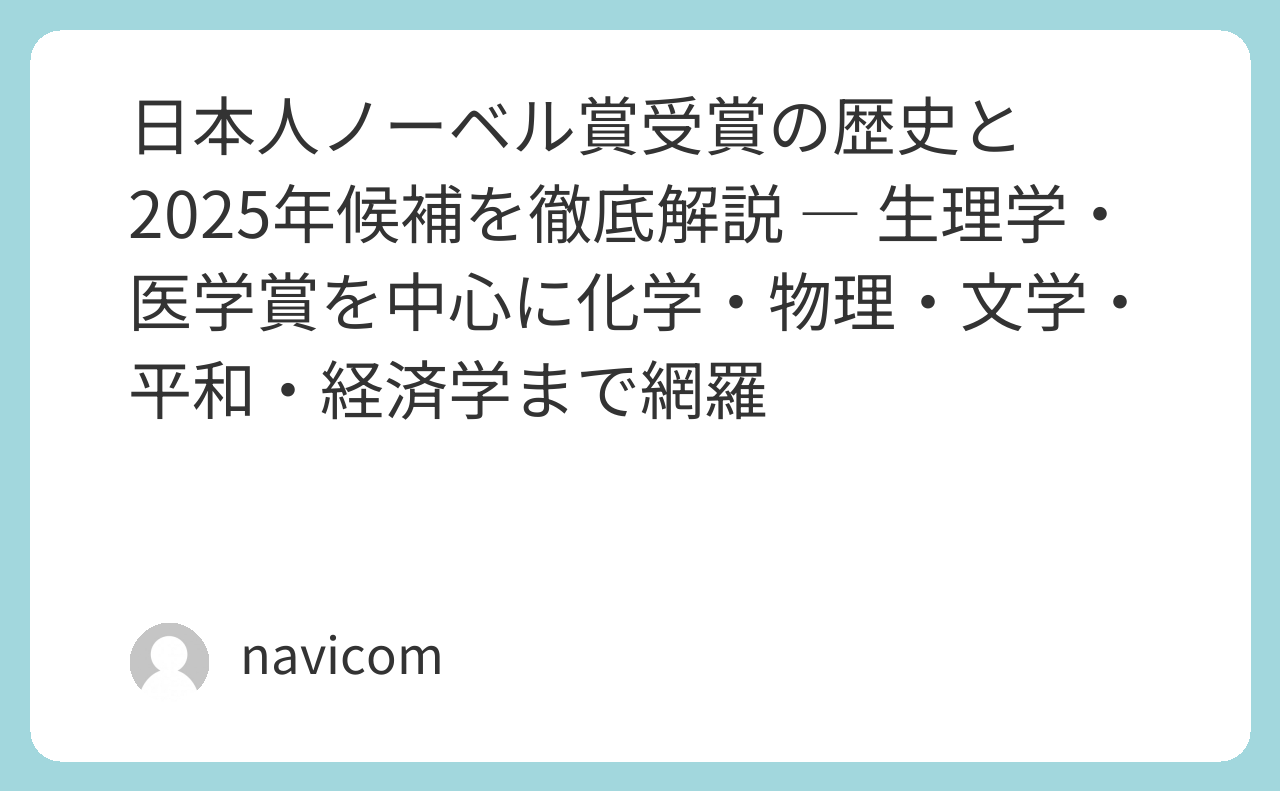 そこでこの記事では、日本人のノーベル賞受賞の歴史を、生理学・医学賞を中心に化学・物理・文学・平和・経済学まで網羅的に紹介しています。受賞者一人ひとりの研究内容や功績、人物像、受賞時のエピソードを丁寧に解説し、iPS細胞やオートファジー、青色LED、リチウムイオン電池などの研究が社会や日常生活にどのように役立っているかもわかります。また、日本と世界の受賞状況や時事トピック、賞金の使い道、中学受験で役立つトリビア情報まで整理されており、学習や読書としても楽しめる構成です。さらに表や図解を活用し、受賞年、大学、年齢、研究分野がひと目でわかるため、ノーベル賞の全体像や日本人研究者の活躍を、初心者でも理解しやすくまとめています。この1記事を読むことで、ノーベル賞の意義や日本人の偉業、最新の研究動向まで幅広く知ることができます。